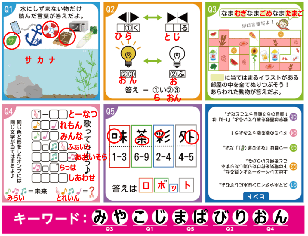 Q1回答★ さかな ➡ プログラムで「さかな」のイラストを探すと②のブースが近いよ!②ブース付近に設置されたキーワードは「こじ」